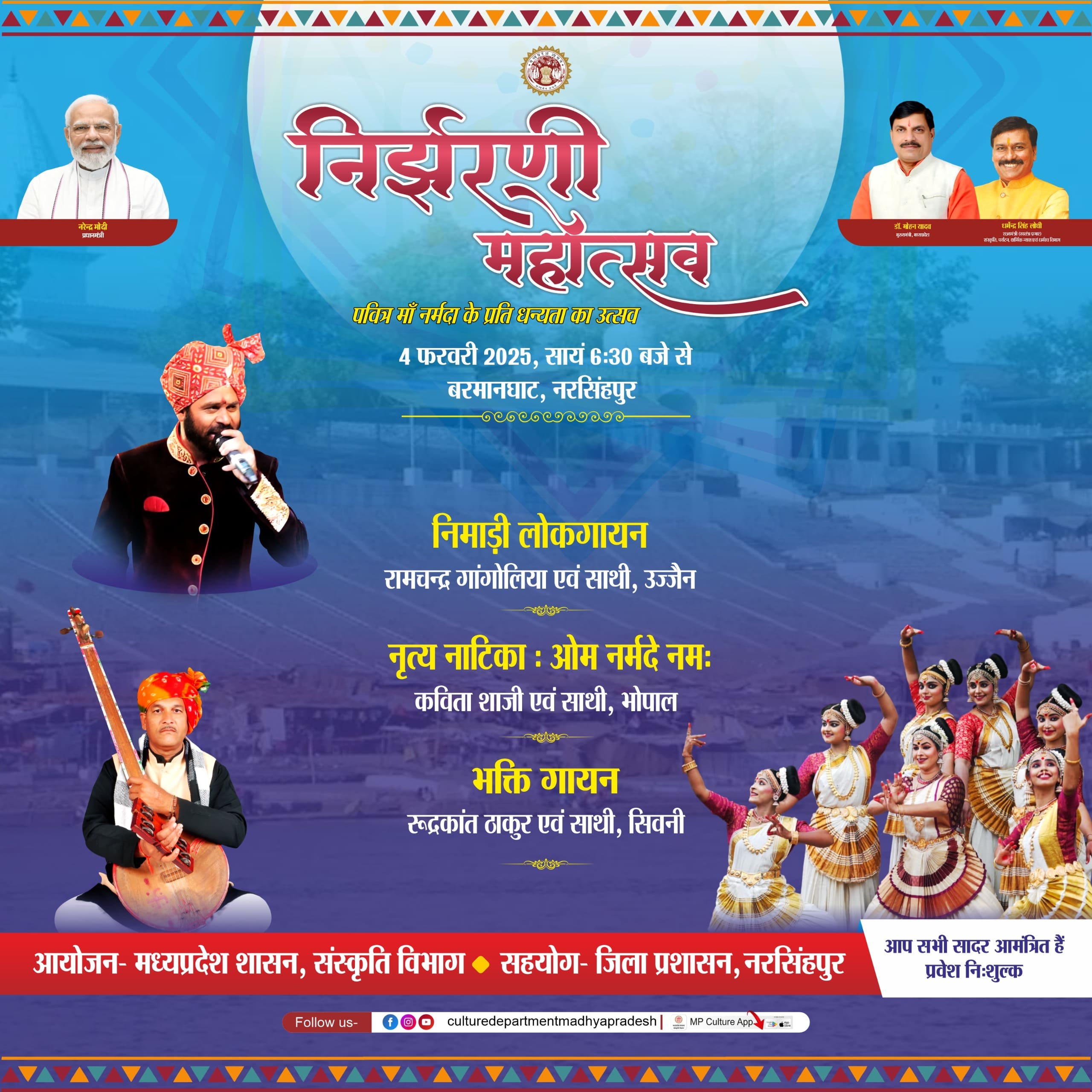 निर्झरणी महोत्सव पवित्र माँ नर्मदा के प्रति धन्यता का उत्सव 4 फरवरी 2025, सायं 6:30 बजे से बरमानघाट, नरसिंहपुर निमाड़ी लोकगायन रामचन्द्र गांगोलिया एवं साथी, उज्जैन नृत्य नाटिका : ओम नर्मदे नमः कविता शाजी एवं साथी, भोपाल भक्ति गायन रूद्रकांत ठाकुर एवं साथी, सिवनी आयोजन - मध्यप्रदेश शासन, संस्कृति विभाग • सहयोग - जिला प्रशासन, नरसिंहपुर आप सभी सादर आमंत्रित हैं प्रवेश निःशुल्क