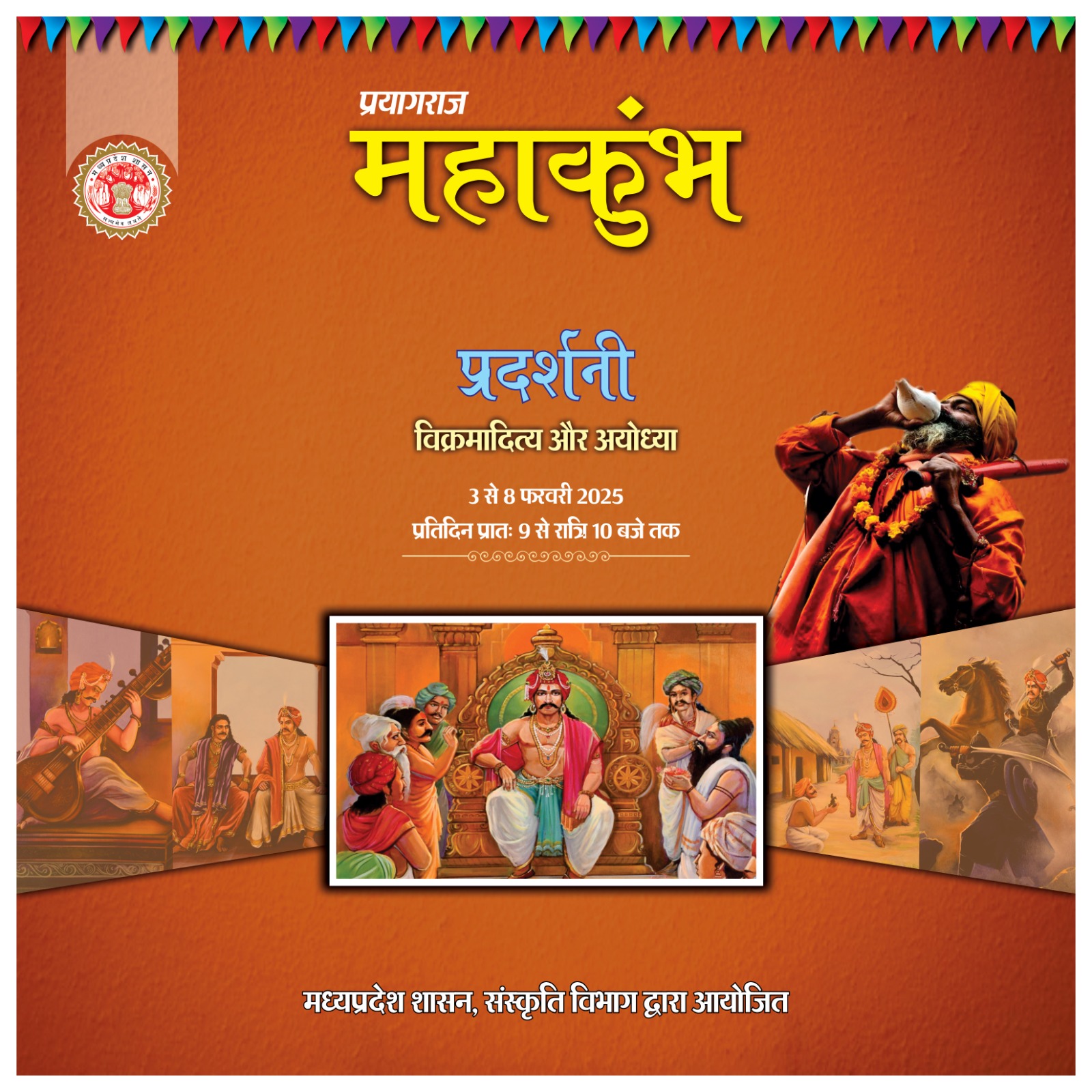 प्रयागराज महाकुंभ प्रदर्शनियाँ प्रतिदिन प्रातः 9 से रात्रि 10 बजे तक मध्यप्रदेश मण्डप, सेक्टर-7, कैलाश पुरी मार्ग, पूर्वी पटरी, प्रयागराज मध्यप्रदेश शासन, संस्कृति विभाग द्वारा आयोजित